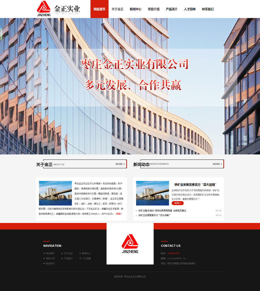 祝賀金正實(shí)業(yè)有限公司網(wǎng)站上線 公司介紹: 棗莊金正實(shí)業(yè)位于山東南部。處在京臺(tái)高速、京滬高鐵、津浦鐵路中間位置,距鐵路專用貨場5公里,距徐州觀音機(jī)場70公里,毗臨日照港、青島港、連云港三大出海口,交通便利、快捷。 金正實(shí)業(yè)是集采礦、選礦、冶煉、煤化工、投資、貿(mào)易為一體不斷發(fā)展,已成為魯南地區(qū)較有影響力的大型企業(yè)。下設(shè)金正礦業(yè)、新疆雙全五洋能源、并參股伊犁特煤化工、新疆國投寶地能源等公司,F(xiàn)有職工3000余人,資產(chǎn)20億元。先后獲得棗莊百強(qiáng)企業(yè)、突出貢獻(xiàn)企業(yè)、誠信經(jīng)營企業(yè)、納稅十強(qiáng)企業(yè)、山東省工會(huì)工作先進(jìn)企業(yè)等榮譽(yù)稱號(hào)。 金正礦業(yè)年產(chǎn)鐵精粉60萬噸,金正實(shí)業(yè)年產(chǎn)鑄造用生鐵26萬噸,主要銷往江蘇、浙江、福建、安徽、河北、山東等地,深受廣大客戶好評(píng)。 公司始終秉承“多元發(fā)展、合作共贏”的經(jīng)營理念,遵循“精誠團(tuán)結(jié)、銳意進(jìn)取”的企業(yè)精神。竭誠為客戶提供優(yōu)質(zhì)的產(chǎn)品和服務(wù)。真誠歡迎各界同仁前來指導(dǎo)、合作,我們?cè)概c您風(fēng)雨同舟、攜手共創(chuàng)美好未來。 棗莊金正實(shí)業(yè)有限公司